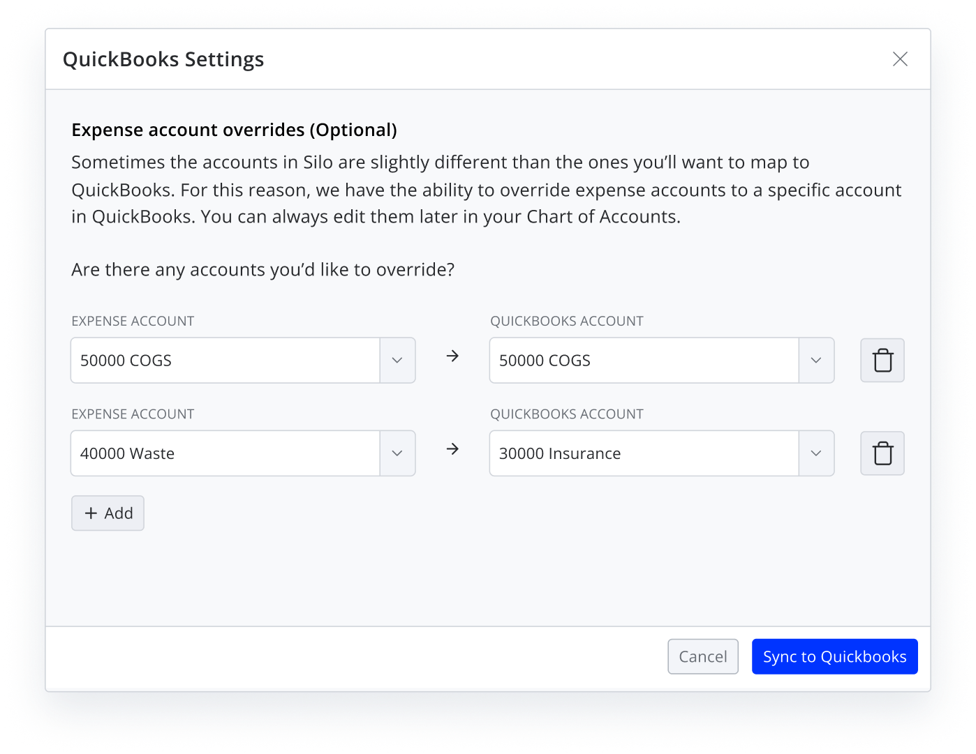 For every expense users create in Silo, accounting users must add a ‘Silo expense category’ to the transaction so they can accurately track their expenses. When there is not a Silo category that easily matches their QuickBooks accounts, users have to create an expense override.