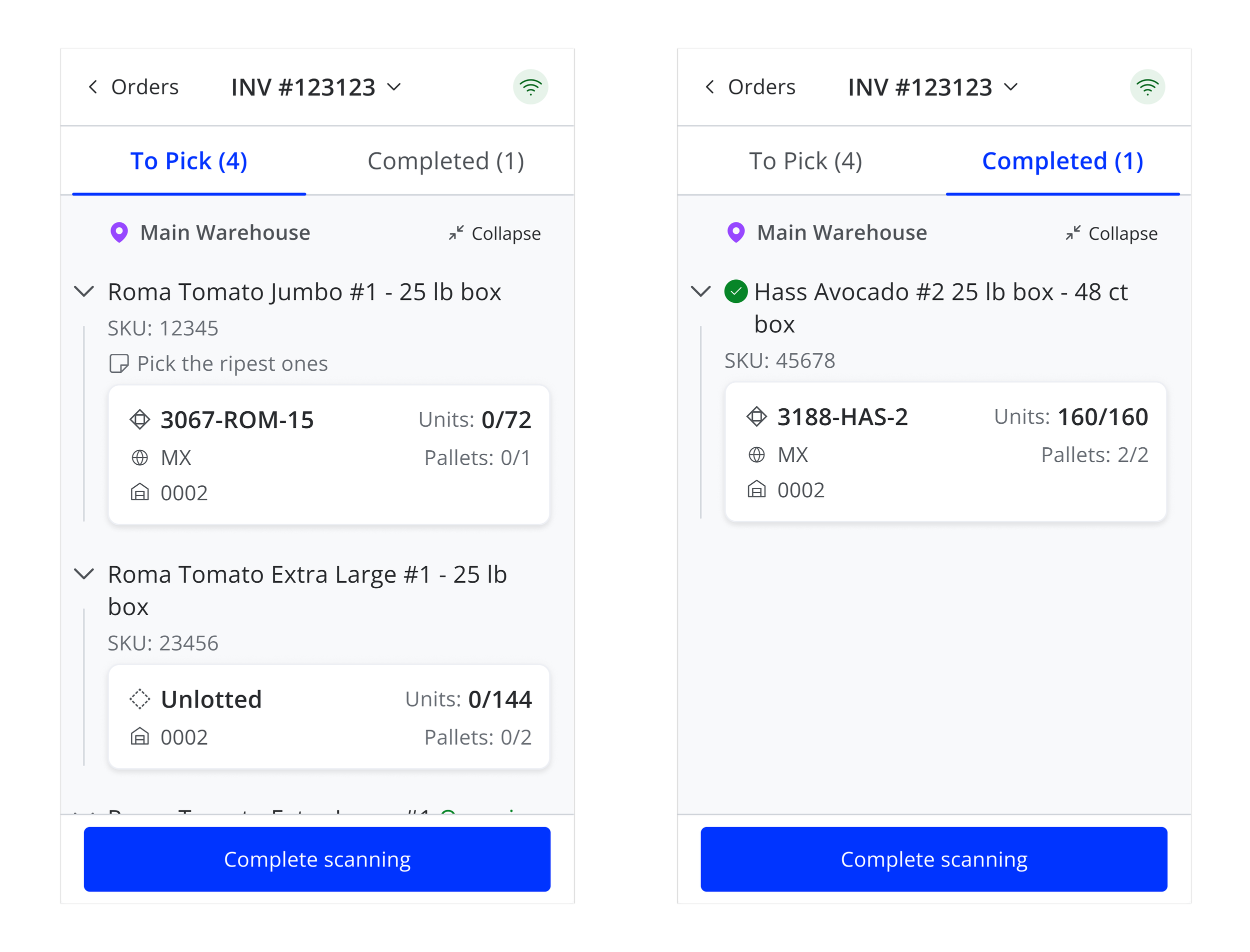 Some orders have many items to pick and pickers need to see the progress they make while working on an order. We decided to separate items left “to pick” from “completed” items to keep the user focused on what else is left to pick.